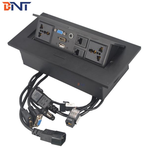 Press the top of the conference table socket, the mechanical Locking device inside the desktop socket plugs will be released and the connection panel will be opened smoothly by the Pneumatic Support Structure, and use the seams on the panel which user could connect Video, Audio, Network, Telephone, Power and so on. After using the tabletop power data connectors, Just press the panel cover, the Mechanical Locking Device inside the desktop power outlets will lock the box. The locked connection box is flush with the tabletop and all the connections are hidden dexterously. The neat & elegant topside of the box together with the tabletop form an integrated mass.